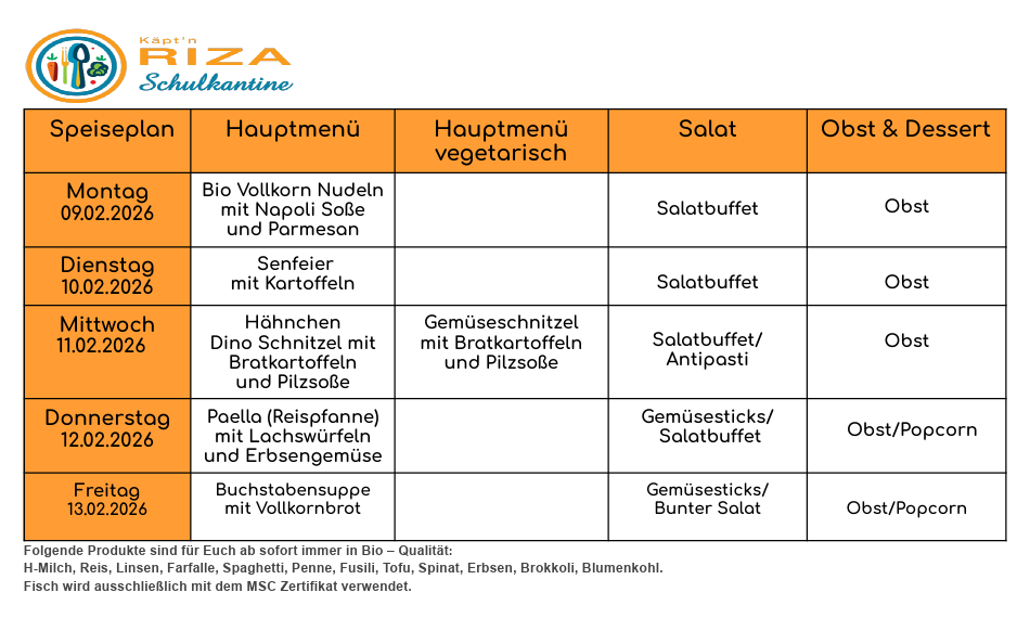 Die Kinder eines Jahrgangs essen in der Zeit von 13.00 – 14.00 Uhr gemeinsam mit ihren ErzieherInnen im Kinderrestaurant. Das vollwertige Mittagessen wird täglich frisch zubereitet. Hinsichtlich der Speiseplanung und des Einkaufs ist es dem Caterer „Käpt’n Riza“ wichtig, saisonale und regionale Produkte zu verwenden. In den Speisen wird auf Schweinefleisch verzichtet.